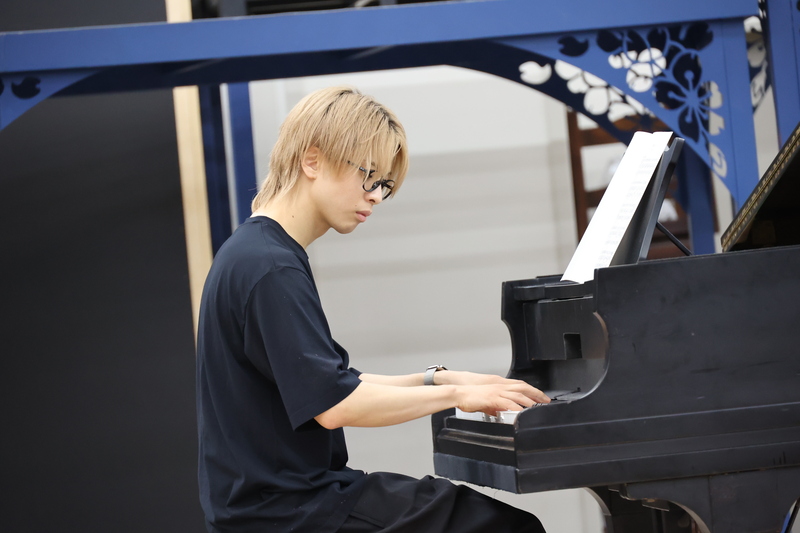 冒頭の公生のソロ「僕にピアノが聞こえないなら」で、岡宮の繊細な哀しみを含んだ歌声が響くと、それまで和やかだった稽古場の空気が一変し、作品世界が立ち上がってきます。岡宮の佇まいから孤独を抱える公生が現れ、それを見つめる東島はじめ周りのキャストの真剣な表情も印象的でした。