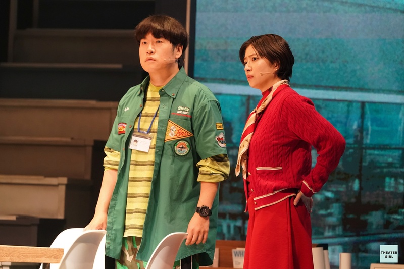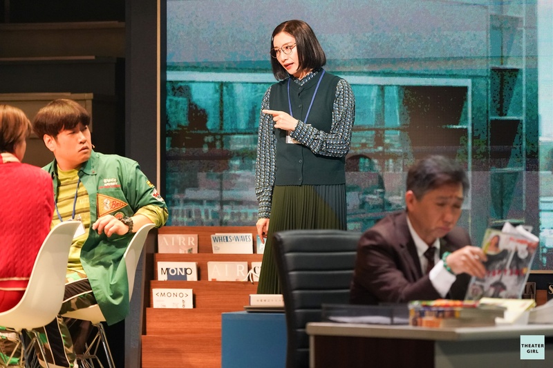 私が演じる神田川さんはこの会社で一番の古株で、デザイナーやプランナーたちの中でひとり事務職をしております。一幕ではどれだけ地味に事務所に馴染んで、存在感を薄くできるかということを目標にして演じています。はじめは社内のみんなからも全く話しかけられないのですが、タイムループというものをきっかけに社員一丸となって乗り切るときに、すごくいきいきとした姿になることにやりがいを感じております。