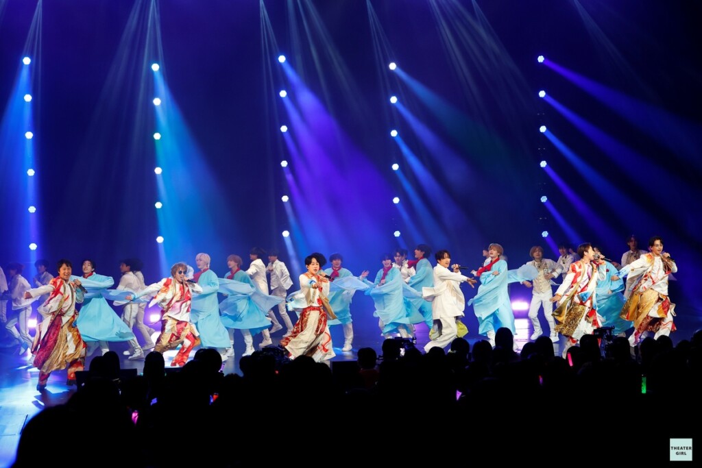さらに藤原×大橋×末澤×今江という懐かしい顔ぶれで「Hair」をクールにダンスパフォーマンス、当時は全員10代だった大西×道枝×長尾謙杜×高橋恭平×佐野晶哉が大人になって歌う「SUPER ROCKET」など松竹座を彩った楽曲をノンストップで熱唱する。