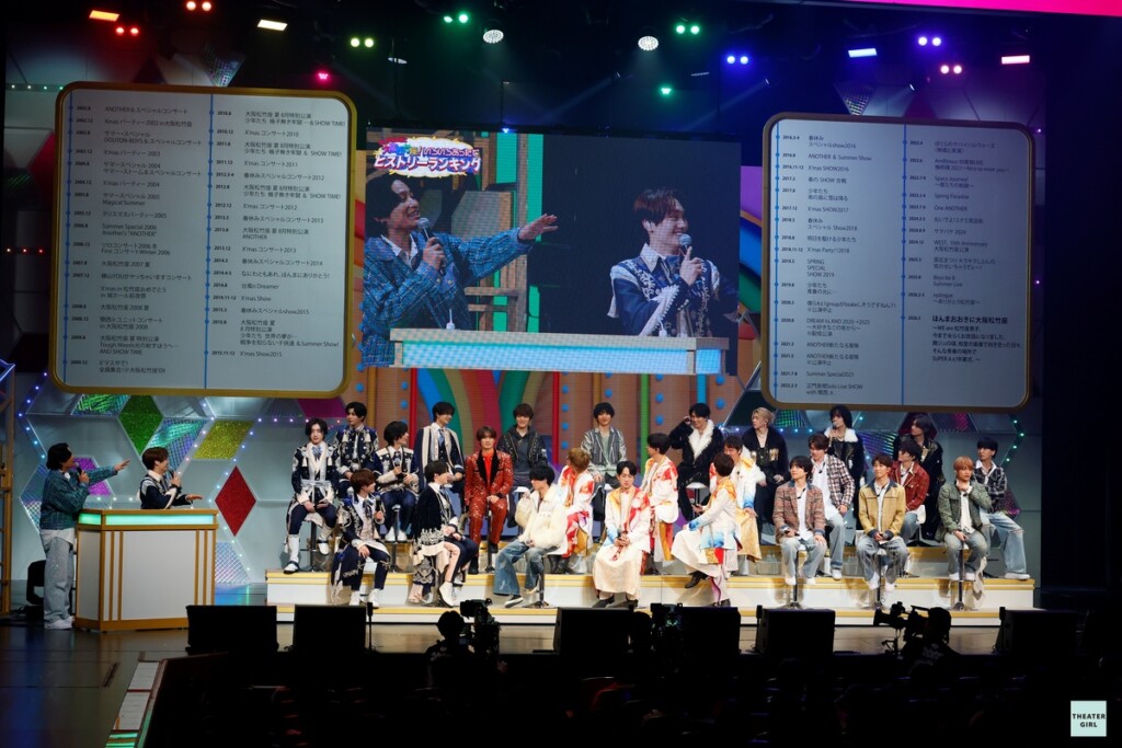 続いてステージの盆が回り、大倉忠義の力強い太鼓でSUPER EIGHTが登場。デビュー曲「浪花いろは節」でさすがの貫禄を見せつける。村上信五の仕切りで始まった小MCでは、重岡大毅、大橋和也、小島健が順に挨拶し、永瀬、向井、室、今江も並んでわちゃわちゃトーク。そんな姿を見つめる客席に多幸感が広がっていく。ここからは桐山照史と藤原丈一郎に仕切りをバトンタッチして、4グループでバラエティ企画に挑戦。事前アンケートの回答をもとに『ほんまにおおきに大阪松竹座!いろいろあったでヒストリーランキング』と題して、松竹座で過ごした思い出を振り返った。